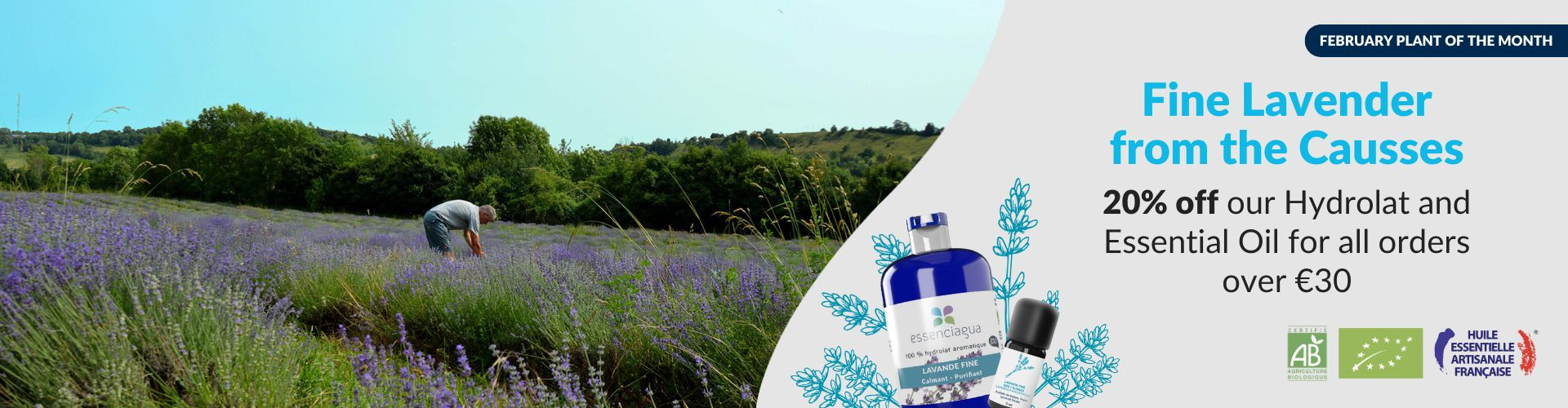 All our essential oils and hydrolats are 100% pure and natural, distilled from wild or cultivated plants. They are all certified organic and carry the AB mark, owned by the French Ministry of Agriculture.