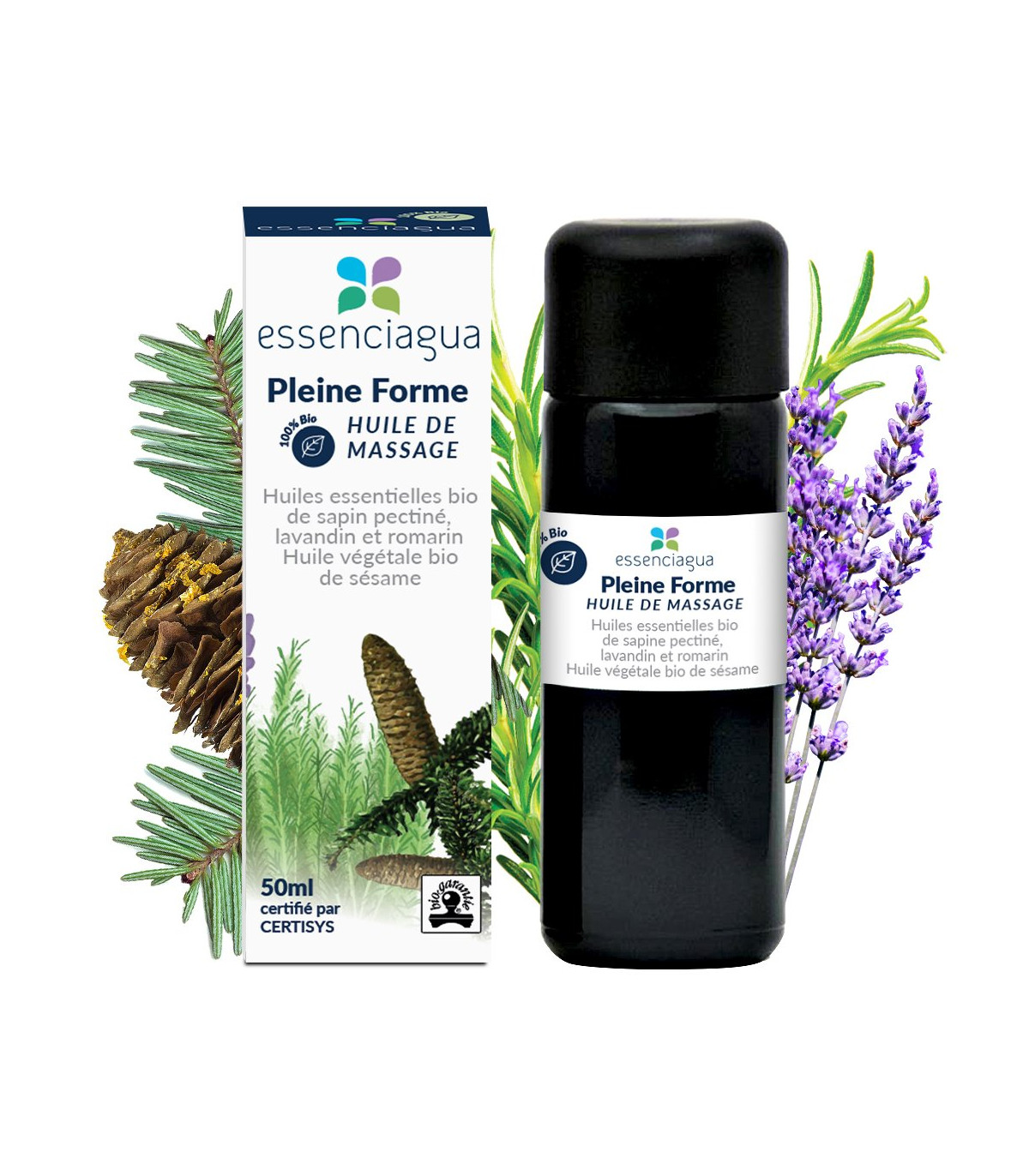 The Full Form Massage Oil from Essenciagua, carrying the “Biogarantie” label, is a soothing and revitalizing complex, ideal for relieving joint and muscle pain. This unique blend includes organic sesame vegetable oil and organic essential oils of lavandin, rosemary, and silver fir.