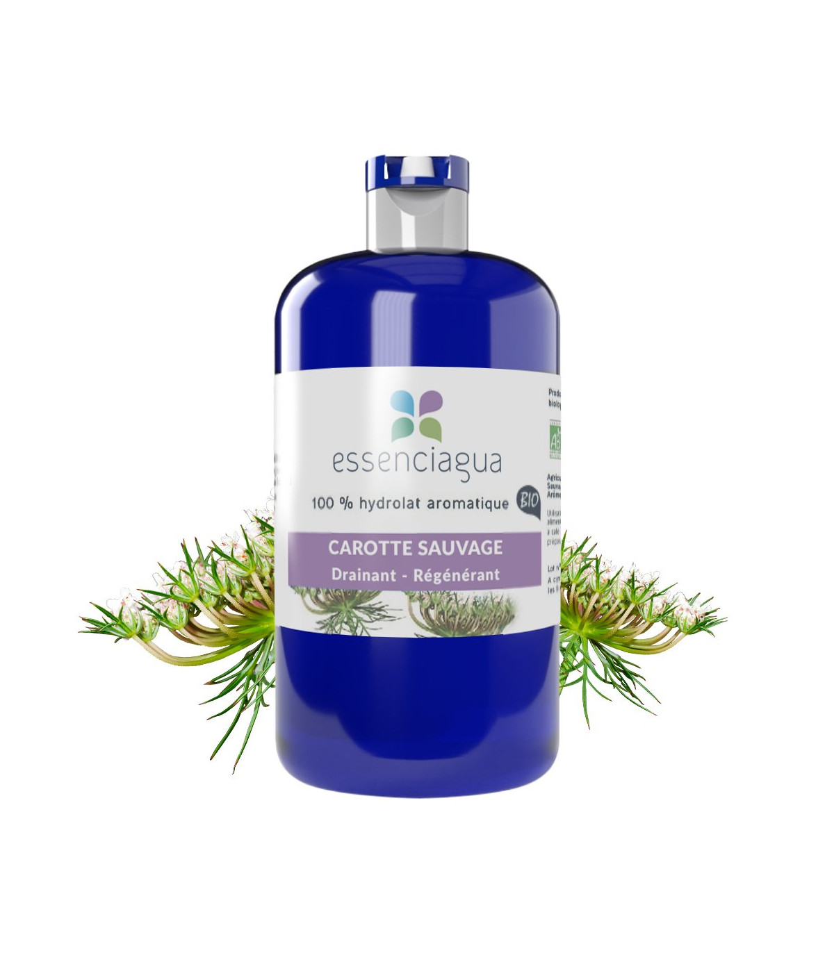 Hydrolat de carotte sauvage bio et artisanal par Essenciagua : revitalise, tonifie et illumine la peau naturellement. Parfait pour une beauté authentique.