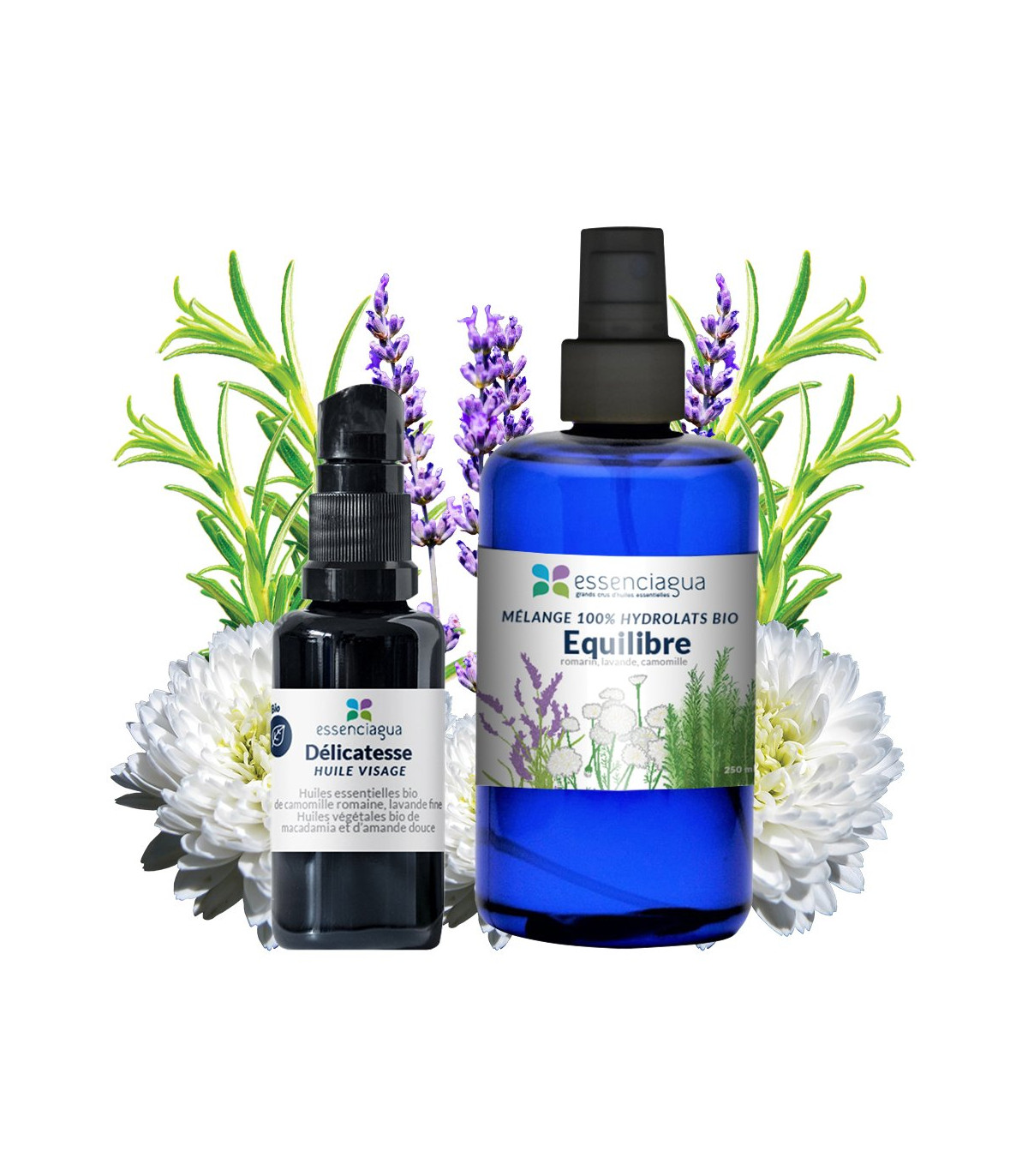 Découvrez la Routine Visage Délicatesse d’Essenciagua, une alliance parfaite d’huiles essentielles bio et d’huiles végétales conçue pour apaiser et réparer les peaux sensibles. Ce rituel de soin comprend une Huile Visage Délicatesse (30 ml) et un mélange d’hydrolats Équilibre (250 ml), formant une routine douce et efficace pour votre peau.
